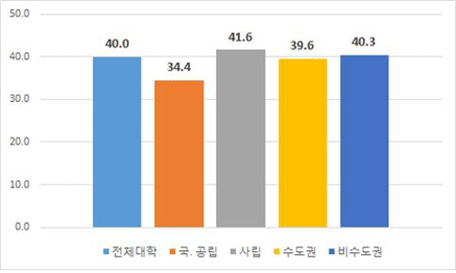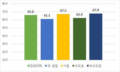 교원 강의 담당 비율은 2017학년도 1학기 전임교원 강의 담당 비율이 65.8%로 전년(64.4%) 대비 1.4%p 상승했다. 국·공립대와 사립대 모두 전임교원 강의 담당 비율이 전년 대비 상승(국·공립: 60.5%→61.1%, 사립: 65.5%→67.2%)했고 비수도권 대학 전임교원 강의 담당 비율이 67.9%로 수도권 대학(62.4%)보다 5.5%p 높았다.