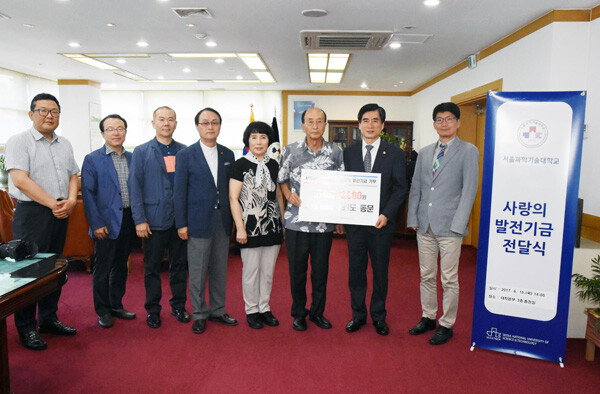 [대학저널 신효송 기자] 서울과학기술대학교(총장 김종호) 기계과 동문 조원도 씨(前 수퍼에이트호텔 캐나다 대표)가 지난 15일 총장실에서 김종호 총장, 홍사성 총동문회 사무총장 등 주요보직자가 참석한 가운데 후학양성을 위한 발전기금 1000만 원을 기부했다.