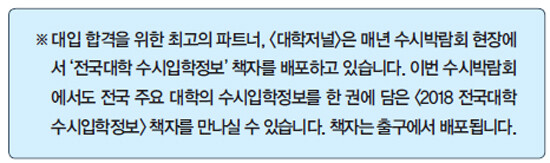 “매년 수시박람회장에는 수많은 인파가 몰립니다. 따라서 아무 준비 없이, 막연히 수시박람회장을 방문하면 시간만 낭비할 수 있습니다. 이를 예방하기 위해 첫째, 철저한 사전 준비가 필요합니다. 즉 수시박람회에 가기 전에 참가 대학 리스트를 확인해야 하고, 수시박람회장에서는 대학 부스 위치를 확인해야 합니다. 2018 수시박람회 참가 대학 리스트는 월간 <대학저널>과 인터넷 신문 e대학저널(http://www.dhnews.co.kr)에서 확인하실 수 있습니다. 또한 대학 부스 배치도는 2018 수시박람회장 출구와 입구에서 얻을 수 있습니다.