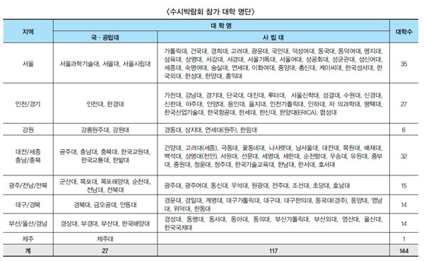 “전국에서 144개 대학이 참가합니다. 참가 대학 명단은 아래 표를 참고하시기 바랍니다.”