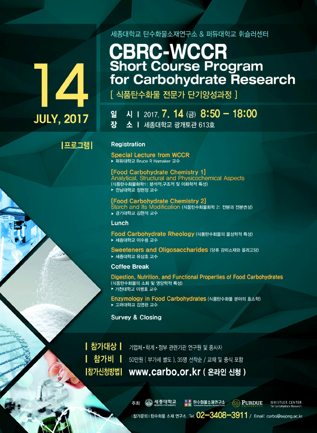 [대학저널 신효송 기자] 세종대학교(총장 신 구) 탄수화물소재연구소(Carbohydrate Bioproduct Research Center, CBRC)가 미국 퍼듀대학교 Whistler Center for Carbohydrate Research (WCCR)와 국제 공동협력사업의 일환으로 식품탄수화물 전문가 단기양성과정을 오는 7월 14일 오전 8시 50분부터 오후 6시까지 세종대 광개토관 613호에서 개최한다.