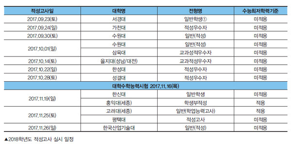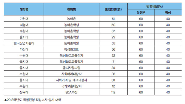 한편 농어촌학생전형, 특성화고교출신자전형 등과 같이 별도 자격요건이 요구되는 특별전형 가운데 적성고사를 통해 선발하는 대학도 있습니다. 따라서 해당 자격요건을 갖춘 학생은 모집인원, 전년도 경쟁률 등을 참고해 지원전략을 세울 수도 있습니다.