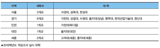 2018학년도 수시 학생부교과전형에 속하는 적성고사를 실시하는 대학은 올해 신설한 평택대(86명), 폐지 1년 만에 부활시킨 한성대(363명)를 포함해 총 12개 대학입니다. 전년도 4562명에 비해 320명 증가한 4882명을 선발할 계획입니다.