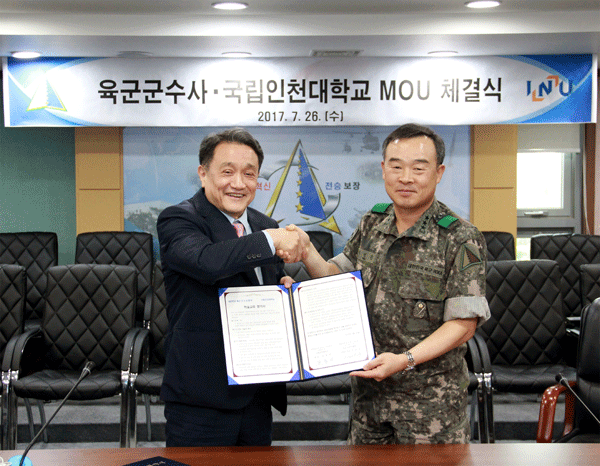 [대학저널 신효송 기자] 인천대학교(조동성 총장)와 육군군수사령부(사령관 이정근 중장, 이하 군수사)가 지난 26일 대전 군수사 회의실에서 상호 협력을 위한 업무 협약(MOU)을 체결했다.