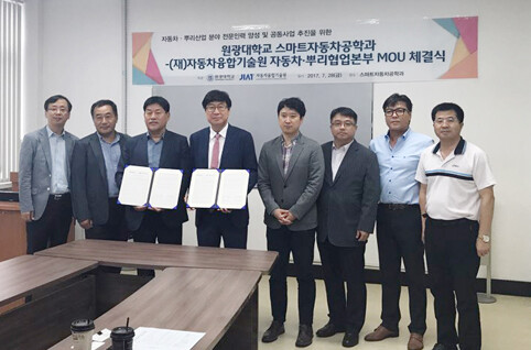 원광대 스마트자동차공학과는 지난 28일 원광대 창의공과대학 세미나실에서 (재)자동차융합기술원 자동차·뿌리협업본부와 상호협력협약을 체결했다.