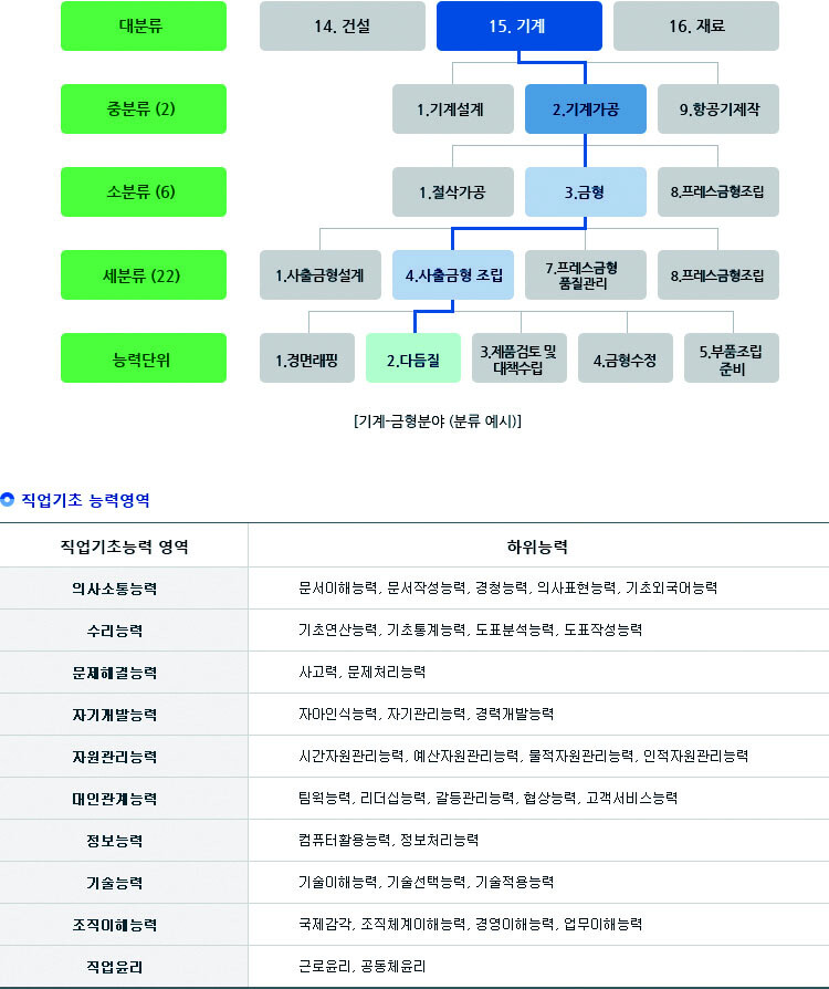 기계 분야(대분류)를 예로 들어보자. 중분류에는 기계설계, 기계가공, 항공기 제작 등이 포함된다. 중분류에서 기계가공을 선택하면 절삭가공, 금형, 프레스금형조립 등이 소분류로 나뉜다. 이어 소분류에서 금형을 선택하면 사출금형설계, 사출금형조립, 프레스금형 품질관리, 프레스금형조립 등이 세분류로 등장한다. 마지막으로 세분류의 사출금형조립을 선택하면 능력단위로 ‘다듬질 역량’이 제시된다. 쉽게 말해 기계 분야에서 사출금형조립 업무를 하고 싶다면 NCS에서 규정한 직업기초능력과 ‘다듬질 역량’을 갖춰야 한다.