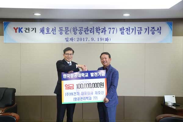 [대학저널 신효송 기자] 한국항공대학교(총장 이강웅)가 지난 19일 동문인 YK건기 채호선 대표(항공관리학과, 77학번)로부터 발전기금 1억 원을 기부받았다.