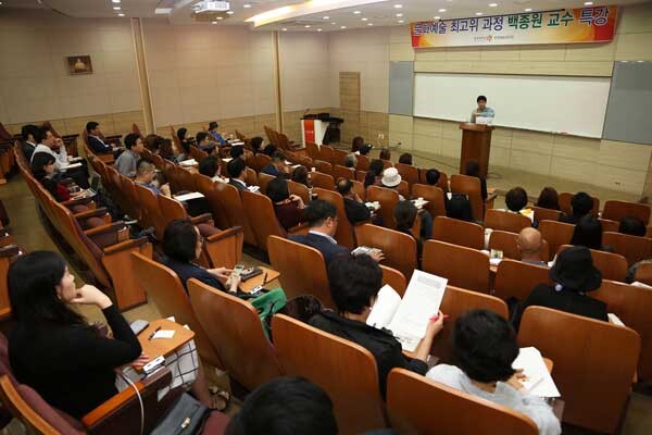 이날 강의는 학생들이 사전에 질문사항을 적어놓은 쪽지를 백 대표가 무작위로 뽑아 그 질문에 대한 답변을 하는 형식으로 진행됐다.