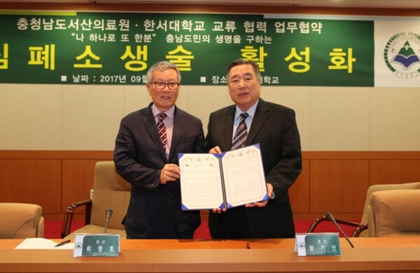 한서대 본관 접견실에서 진행된 협약식에서 함기선 한서대 총장과 최영호 충청남도서산의료원장은8개 항으로 구성된 협정서에 서명했다.