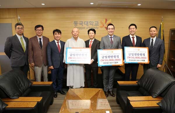 이날 전달식에는 태원비엠씨 김민수 대표이사, ㈜포워드퓨처 여원동 대표이사, ㈜엔씨웍스 윤형보 대표이사 등 3명을 비롯해 동국대 한태식 총장, 이관제 대외부총장, 성창수 교수, 전병훈 교수 등이 참석했다.