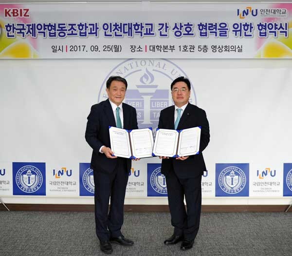 [대학저널 신효송 기자] 인천대학교(총장 조동성)와 한국제약협동조합(이사장 조용준)은 25일 인천대 송도캠퍼스 본관 5층 영상회의실에서 상호 협력을 위한 업무 협약을 체결했다.