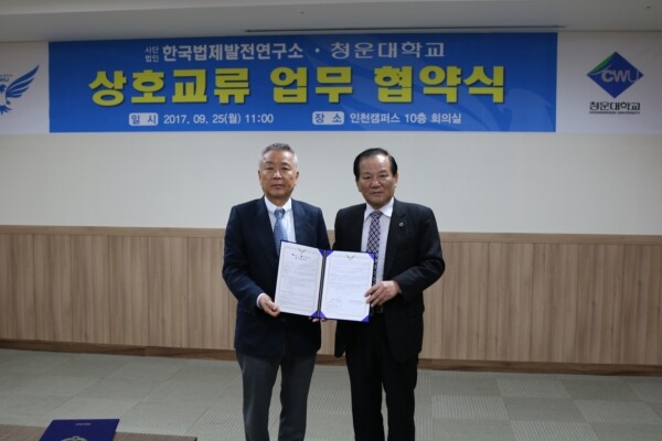 [대학저널 박용우 기자] 청운대학교(총장 이상렬)는 25일 (사)한국법제발전연구소(소장 석종현)와 청운대 인천캠퍼스 10층 회의실에서 업무협약을 체결했다. 이번 협약의 골자는 다문화 관련 법제의 연구, 조사, 발전적 대안 모색을 위한 용역연구 및 법률자문에 있어서 양 기관이 상호발전과 국가 발전 등 상호 긴밀한 협조가 필요하다는 것을 인식하고 다문화 협업시스템을 구축하는 것이다.