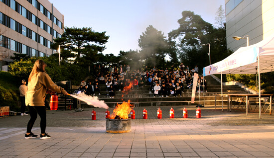 2일차에는 교직원과 학생 150여 명이 참가한 가운데 소화기 사용법 교육을 통해 화재사고에 대응하기 위한 훈련을 실시했다.