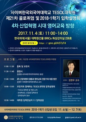 [대학저널 임지연 기자] 사이버한국외국어대학교(총장 김중렬) TESOL대학원이 오는 11월 4일 한국외대 서울캠퍼스 대학원에서 '제21차 콜로퀴엄 및 2018학년도 1학기 신입생 입학설명회'을 개최한다.