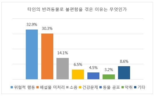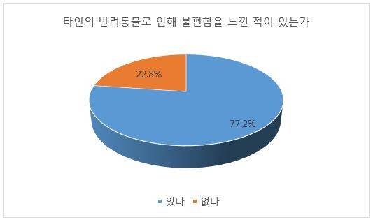 '타인의 반려동물로 인해 불편함을 느낀 적이 있는가'라는 질문에는 77.2%가 있다고 대답했다. 불편함을 겪은 이유로는 '위협적 행동이나 갑작스러운 접근'(32.9%)이 가장 많았다. 그 다음으로는 ▲배설물 미처리(30.3%) ▲소음(14.1%) ▲알러지나 아토피 등 건강문제(6.5%) ▲동물이 싫거나 무서움(4.5%) ▲악취(3.2%) 순이었다.