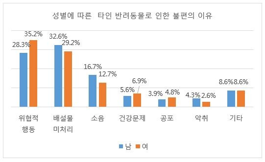 불편함을 겪은 이유로 여성은 위협적 행동(35.2%)을, 남성은 배설물 문제(32.6%)를 가장 많이 꼽았다. 특히 여성의 경우 동물에 대한 공포로 불편함을 느낀다는 응답이 전체의 4.8%를 차지했다.