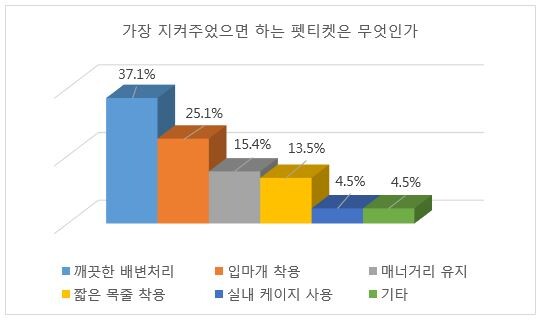 가장 지켜주었으면 하는 펫티켓으로는 '깨끗한 배변처리'가 37.1%로 1위를 차지했다. '맹견이나 입질 심한 개에 입마개 착용'이 25.1%, '타인과 매너거리 유지'가 15.4%, '짧은 목줄 착용' 13.5% 등이 뒤를 이었다.