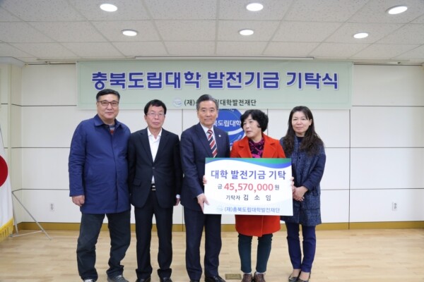 [대학저널 박용우 기자]옥천읍에 거주하는 김소임 씨(62세‧여)가 (재)충북도립대학발전재단(이사장함승덕)에 장학금 4,557만원을 쾌척했다.