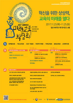 [대학저널 임지연 기자] 교육부가 주최하고 서울교육청(교육감 조희연), 한국교육학술정보원(원장 한석수, KERIS)이 주관하는 ‘2017 대한민국 미래교육박람회’가 23일 일산 킨텍스(KINTEX)에서 개최됐다. 박람회는 25일까지 진행한다.