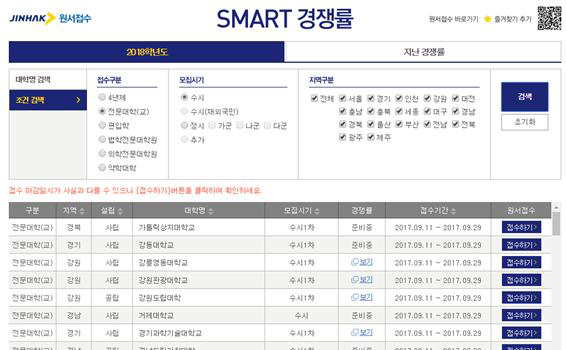 진학사 원서접수에서 제공하는 [SMART 경쟁률] 페이지에서 일부 대학을 제외하고 지난 경쟁률(2015학년도~2017학년도)을 확인할 수 있다. 자신이 희망하는 대학 및 학과의 경쟁률을 미리 알고 지원한다면 도움이 될 것이다.