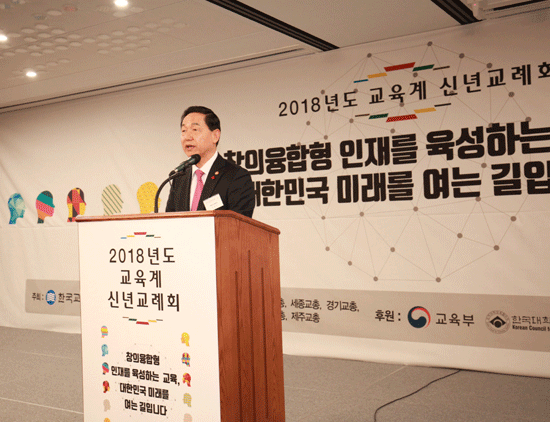 하윤수 교총 회장은 환영 인사에서 "무술년에는 우리 교육이 큰 신뢰와 사랑 속에 변함없이 대한민국 미래를 여는 디딤돌이 되기를 기대한다"면서 "대한민국이 오늘날 기적 같은 발전을 이룩할 수 있었던 것은 교육의 힘이었다. 지금도 교육에서 우리 미래를 찾아야 한다"고 말했다.