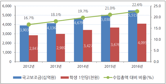 29일 대학교육연구소(이하 대교연)의 '대교연 통계'에 따르면 사립대 국고보조금은 2012년 3조 9028억 원에서 2016년 5조 5147억 원으로 1조 6119억 원 증가했다. 국고보조금이 사립대 수입 총액에서 차지하는 비중도 2012년 16.7%에서 2016년 22.6%까지 증가했다. 학생 1인당 국고보조금은 2012년 약 285만 원에서 2016년 약 410만 원으로 늘었다.