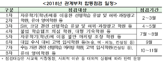 교육부(부총리 겸 장관 김상곤)는 "31일 관계부처가 참여하는 1차 '학원 등 특별점검 범부처협의회(의장: 교육부 차관)'를 개최하고 2월 초부터 11월 말까지 관계부처와 합동으로 지도‧점검을 실시한다"고 밝혔다.