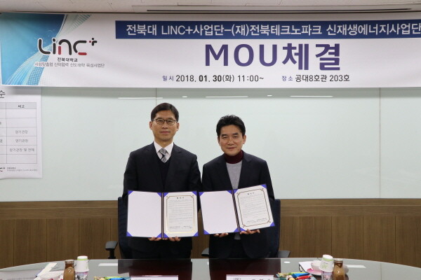 [대학저널 임지연 기자] 전북대학교(총장 이남호) LINC+사업단(단장 고영호)과 (재)전북테크노파크 신재생에너지사업단(단장 김영권)이 지역산업 발전과 산학협력활성화를 위해 공식 업무협약(MOU)을 체결했다.