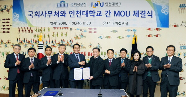 이에 조동성 총장은 “인천대는 관·학 협력의 중심이 되어, 우수한 인적자원의 체계적 관리 운영을 통한 지역과 국가 산업에 기여하는 세계일류대학으로 거듭나기 위해 모든 열정을 바치고 있다”며 “이번 국회사무처와의 MOU 체결은 국회 구성원에게 학위 과정 등의 제공을 통한 평생학습의 기회를 인천대가 선도적으로 제공하는데 의미가 있다”라고 밝혔다.