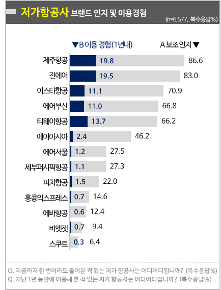 저가항공사 브랜드 인지율은 제주항공(86.6%), 진에어(83.0%)가 선두그룹을 형성했다. 다음은 이스타항공 70.9%, 에어부산 66.8%, 티웨이항공 66.2% 등으로 상위 5개 브랜드 모두 우리나라 국적 LCC였다. 다음은 에어아시아가 46.2%로 외국 국적기 중 가장 높았다. 국적 LCC 중 가장 최근에 진출한 에어서울은 27.5%로 세부퍼시픽 항공 27.3%와 비슷한 수준이다.