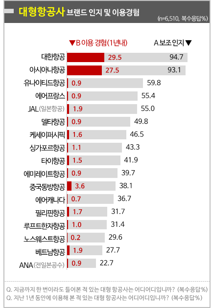지난 1년간의 ‘이용 경험률’은 대한항공이 29.5%, 아시아나항공이 27.5%로 나타났다. 두 항공사 모두 이용 노선은 국제선과 국내선이 절반씩 차지하는 것으로 나타났다. 외국 국적기 중에서는 중국동방항공이 가장 높았으며 3.6%로 나타났다. 이용 경험률 1%가 넘는 외국 대형항공사는 8개이다. 루프트한자항공을 제외한 7개가 아시아 지역 국적기였다.