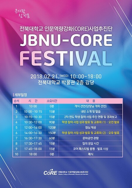 [대학저널 임지연 기자] 전북대 인문역량강화(CORE)사업단(단장 이종민, 이하 전북대 코어사업단)이 지난 2년 동안 추진한 코어사업의 성과를 한자리에서 만나볼 수 있는 ‘JBNU-CORE FESTIVAL’을 오는 21일 전북대 박물관 강당에서 개최한다.