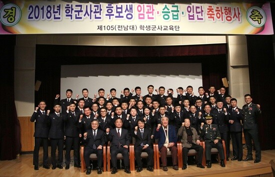 [대학저널 임승미 기자] 전남대학교(총장 정병석) 학생군사교육단(이하 '학군단')이 20일 전남대 용봉홀에서 '2018년 학군단 임관축하 및 승급·입단식'을 개최했다.