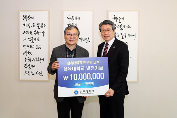 삼육대 동물생명자원학과 전우민 교수는 20일 김성익 총장을 찾아 대학 발전기금 1000만 원을 전달했다.