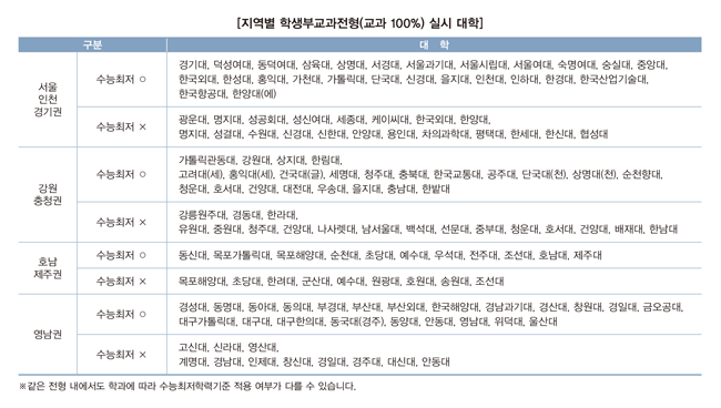 또한 핵심 전형요소를 중심으로 표준화한 대입전형 체계에 따라 수시는 학생부 위주, 정시는 수능 위주의 선발이 안착돼 수시 모집인원 265,862명 중 229,104명(86.2%)을 학생부 위주 전형으로 선발합니다. 정시는 모집인원 82,972명 중 72,251명(87.1%)을 수능 위주 전형으로 선발해 수시와 정시의 전형요소는 명확하게 구분이 되는 편입니다.