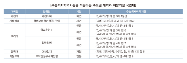 학교생활과 관련한 학생부(교과 성적·비교과 활동) 내용, 자기소개서, 추천서 등의 서류를 전형요소로 활용하지만 추천서를 평가 자료로 반영하지 않는 대학이 늘어나고 있는 것도 특징입니다. 공인어학성적이나 수학, 과학, 외국어 등의 교외 수상실적은 반영하지 않으며 자기소개서나 추천서에 기록하는 경우에는 0점 또는 불합격 처리되니 유의해야 합니다. 학생부종합전형에서 수능최저학력기준을 적용하는 대학은 수도권에서 의예과를 제외하면 7개교, 지방의 거점국립대는 4개교로 대부분 대학에서는 수능최저학력기준을 반영하지 않는 것이 특징입니다.