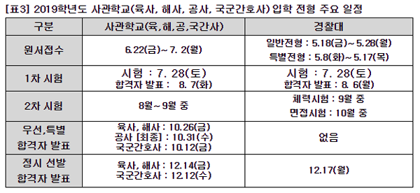 2019학년도 사관학교 1차 학과 시험일정은 경찰대와 동일하게 7월 28일 실시한다. 중복 지원이 불가하다. 1차 학과 시험은 전년도와 유사하게 경찰대는 국어, 영어, 수학 모두 문이과 공통으로 실시된다. 사관학교는 국어와 영어는 문이과 공통으로 수학은 이과가 수학가형, 문과는 수학나형으로 구분돼 실시한다.
