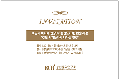 [대학저널 신효송 기자] 강원대학교(총장 김헌영) 강원문화연구소(소장 김풍기)가 4월 4일 오후 2시 강원대 60주년기념관 국제회의실에서 이광재 여시재 원장(前 강원도지사) 초청 특강을 개최한다.