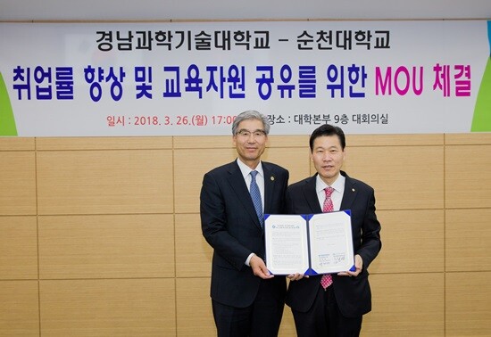 [대학저널 임승미 기자] 순천대학교(총장 박진성)는 경남과학기술대학교(총장 김남경)와 지난 26일 양 대학 총장과 보직 교수 등 20여 명이 참석한 가운데 '학생 1:1 맞춤형 취업 프로그램' 운영에 관한 업무협약을 체결했다.