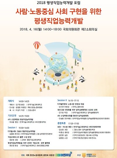 [대학저널 임승미 기자] 코리아텍(총장 김기영)이 오는 4월 16일(월) 국회의원회관 제2 소회의실에서 ‘사람·노동중심 사회 구현을 위한 평생직업능력개발’을 주제로 ‘2018 평생직업능력개발 포럼’을 개최한다.
