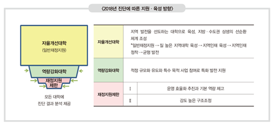 특히 일부 역량강화대학의 경우 일반재정지원 대상에 포함된다. 재정지원제한 Ⅰ유형 대학은 정원감축 권고와 재정지원 일부 제한이 적용된다. 재정지원제한 Ⅱ유형 대학은 정원감축 권고와 재정지원 전면 제한이 적용된다.
