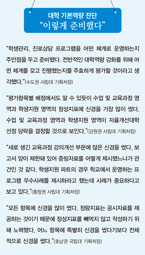 대학들은 ‘2018년 대학 기본역량 진단’에서 자율개선대학 선정을 숙원 과제로 꼽고 있다. 자율개선대학으로 선정돼야 정원감축도 권고받지 않고, 일반재정지원도 별도 평가 없이 받을 수 있기 때문이다.