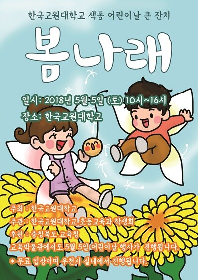 [대학저널 임승미 기자] 한국교원대학교(총장 류희찬)는 오는 5월 5일 한국교원대 교정에서 초등교육과 학생회, 교육박물관 주관으로 풍성한 어린이 날 행사를 개최한다.