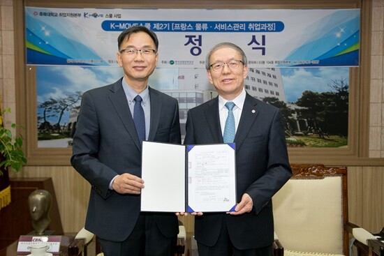 [대학저널 임승미 기자] 충북대학교(총장 윤여표) 취업지원본부는 3일 충북대 대학본부 5층 접견실에서 ‘K-Move스쿨 프랑스 물류·서비스관리 취업과정 2기 약정식’을 진행했다.
