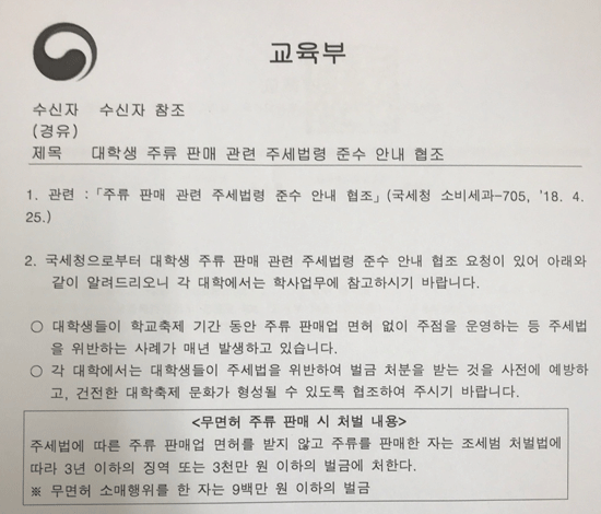 교육부는 공문에서 "대학생들이 학교 축제 기간 동안 주류 판매업 면허 없이 주점을 운영하는 등 주세법을 위반하는 사례가 매년 발생하고 있다. 각 대학에서는 대학생들이 주세법을 위반해 벌금 처분받는 것을 사전에 예방하고, 건전한 대학 축제 문화가 형성될 수 있도록 협조해 주시기 바란다"고 밝혔다.