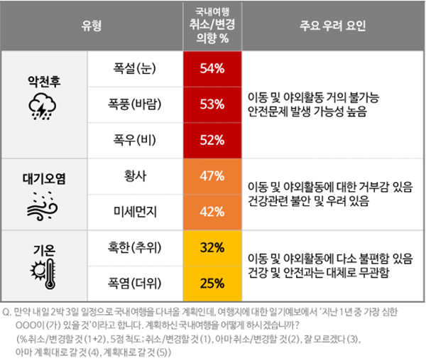 양 기관은 매주 500명 조사를 통해 기상 상황이 국내여행 계획에 어떠한 영향을 주는지 알아봤다. 악천후, 대기오염, 이상 기온과 관련된 기상상황 7가지를 제시하고 ‘2박 3일 일정으로 계획된 국내 여행지에 지난 1년 중 가장 심한 기상문제가 발생할 것’이라는 일기예보가 있다면, 어떻게 할지를 물었다.