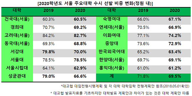 15개 대학의 모집인원(정원 내)을 비교해 보면, 수시 비중이 2019학년도 71.8%에서 69.5%로 소폭 하락한다. 건국대, 숙명여대, 홍익대만이 수시 비중이 소폭 상승했고, 나머지 대학은 수시 비중을 유지하거나 낮췄다. 큰 폭으로 수시 비중이 하락하는 모습을 보인 대학은 서강대와 성균관대다. 서강대는 79.8%에서 70%로 약 10%의 수시 비중 하락을 보였다. 성균관대는 79%에서 66.6%로 12% 이상 수시 비중이 하락했다.
