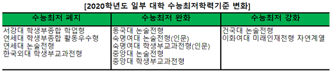 위 대학들과 반대로 기준을 다소 높인 대학들도 있다. 모든 전형에서 수능최저를 적용하지 않았던 건국대는 논술전형에서 그 기준을 다시 도입했다. 또한 이화여대 미래인재전형 자연계열 모집단위는 최저 기준이 소폭 올라간다. 이처럼 2020학년도에는 수능최저학력기준에 변화를 준 대학이 많아 반드시 이를 염두에 두고 지원전략을 세워야 한다.