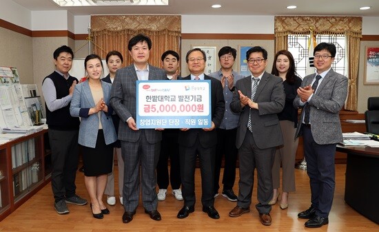 발전기금 500만 원은 송우용 단장과 직원 6명 등 창업지원단 전원이 참여해 마련한 것으로 대학 창업문화 확산과 성공 창업자 육성을 기원하는 마음이 담겼다.