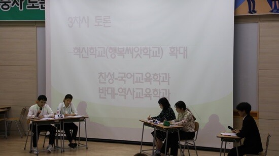 3차시 배틀까지 선발된 국어교육과와 역사교육과는 마지막 배틀에서 ‘혁신학교(행복씨앗학교 등) 확대, 어떻게 생각하십니까?’ 주제로 찬성 입장에서의 국어교육과 입론, 반대 입장에서의 역사교육과 입론을 진행하고 반론과 질문이 이어졌다.